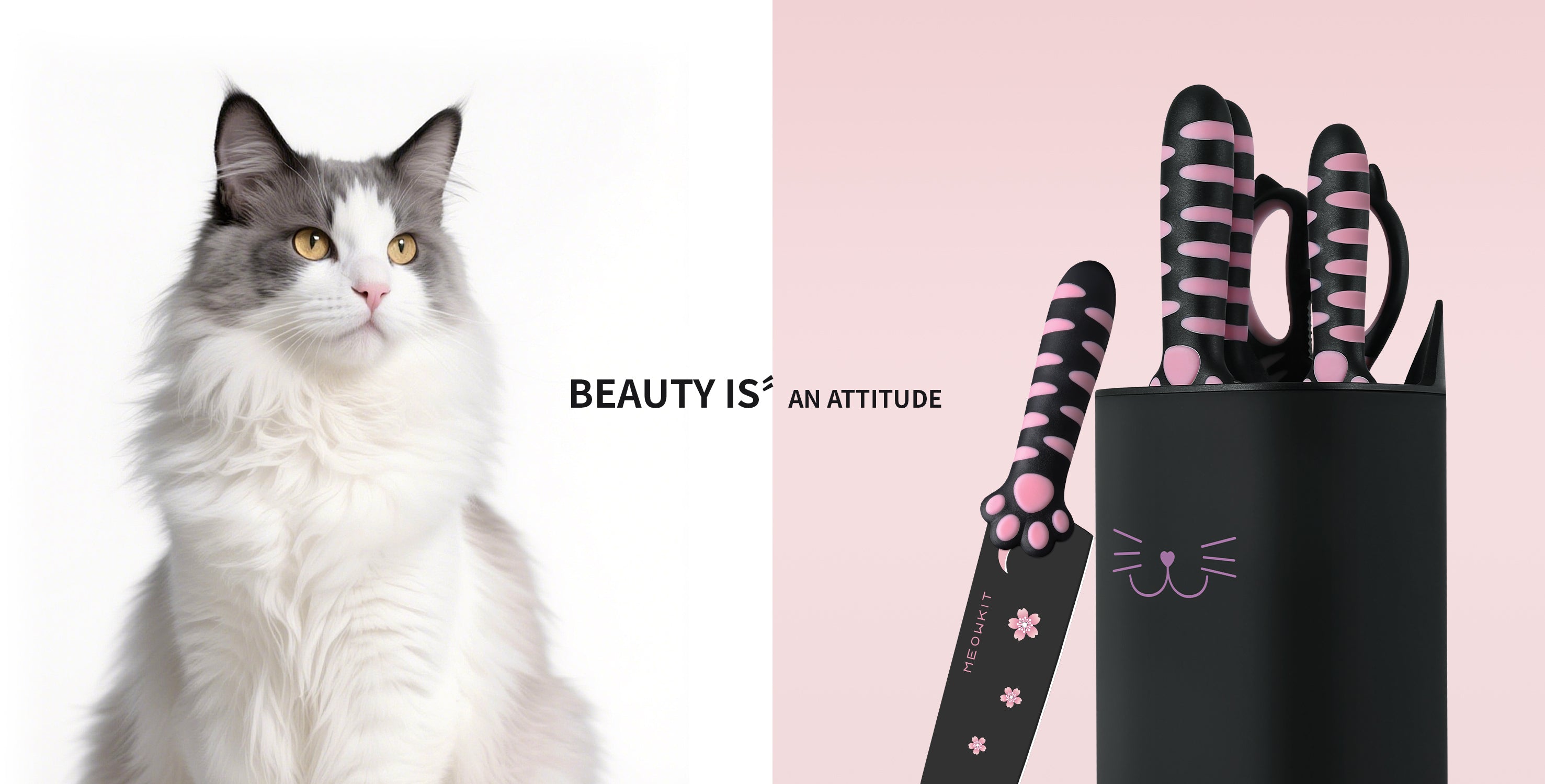 Meowkit 5-Piece Sakura Pink Kitchen Knife Set – Cute Knives with Block and Scissors
